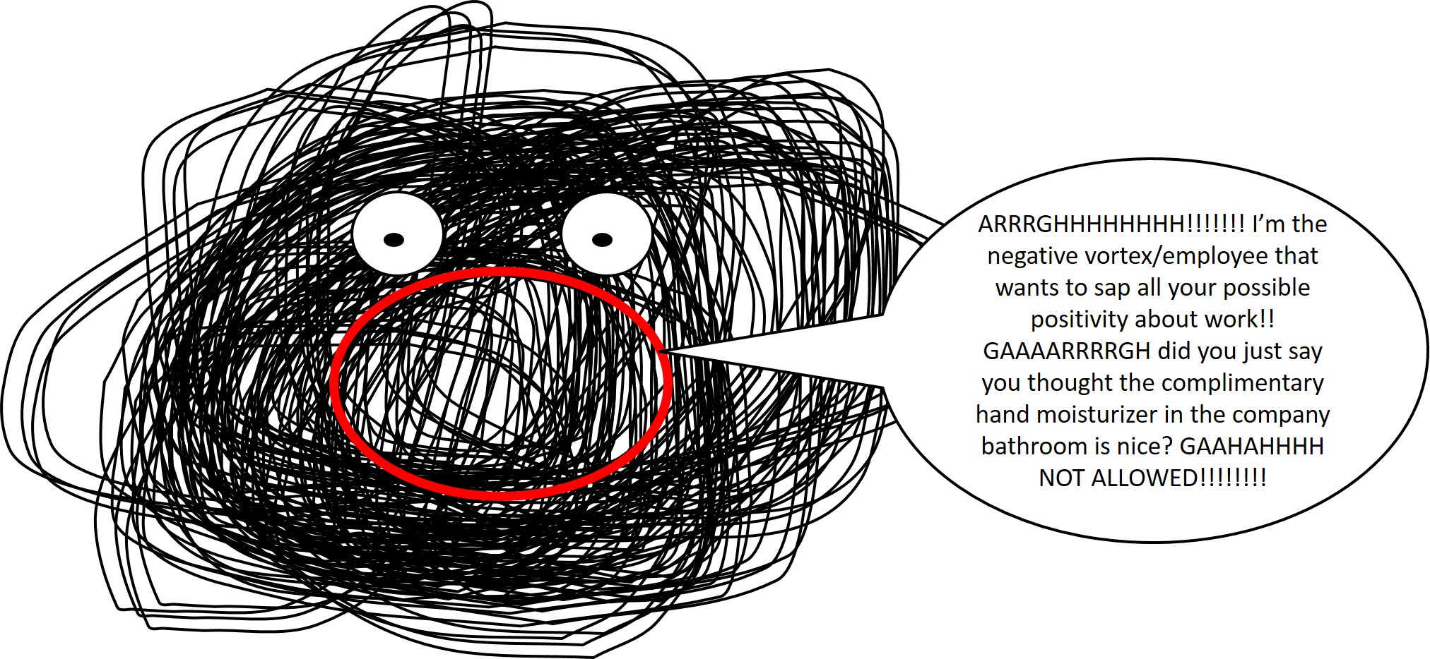 Whilst general negativity at work is just normal to pretty much all workplaces [yes…I’m sure even the fancy employees at new tech companies sometimes hate their inter-level slides and free food and massage rooms and….fuck it those guys have nothing to complain about. They should be so positive that when they smile their teeth are coloured ‘rainbow’] anyway negativity at work is normal. But around The Negative One, there’s like a void of darkness that surrounds them which swallows up any potential positivity like some evil gargoyle that survives only by eating cute baby goats. The Negative One cannot even fathom that the workplace is in any way good for them, but at the same time they don’t do anything about it. They just sit and brood, complaining that they’re not being recognized or too talented for this job, and try to bring as many people into their dark world as possible. It’s really not a good place to be in and if you ever do find that you’re The Negative One, I’d highly recommend doing everything you can to stop being that person.